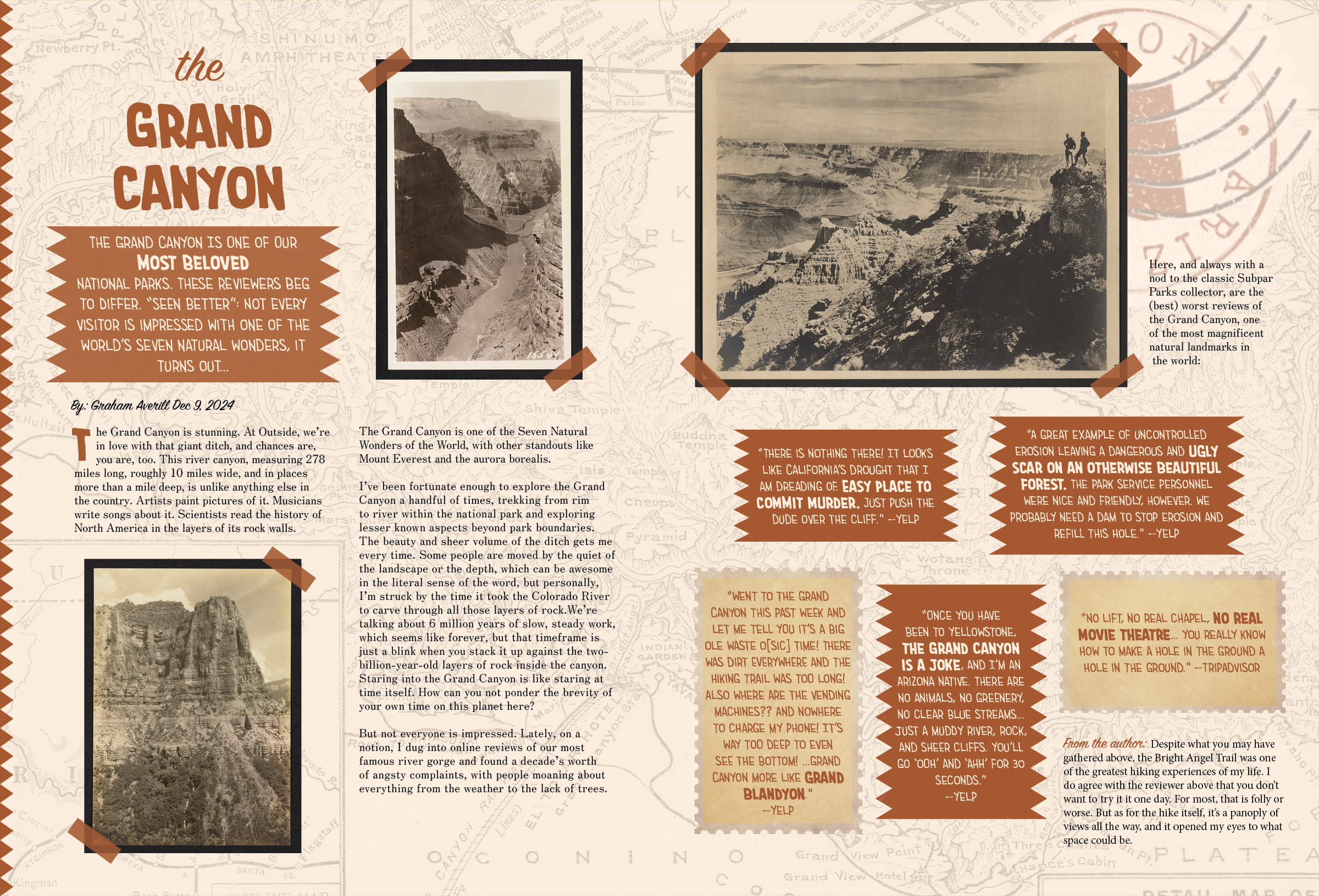 This project was to design a magazine layout for an already provided article, this one highlighting negative reviews of the Grand Canyon. To juxtapose the pessimistic outlook on this beloved national landmark, I designed a spread that reminds the readers why the Grand Canyon became enticing in the first place. I embedded scrapbooking techniques such as stamps, taped in photographs, and overlays to create a layout that feels handmade. The raw earthy colors found in this national park were the incentive behind the ones used within this design in order to present what color is missing within the vintage photos.