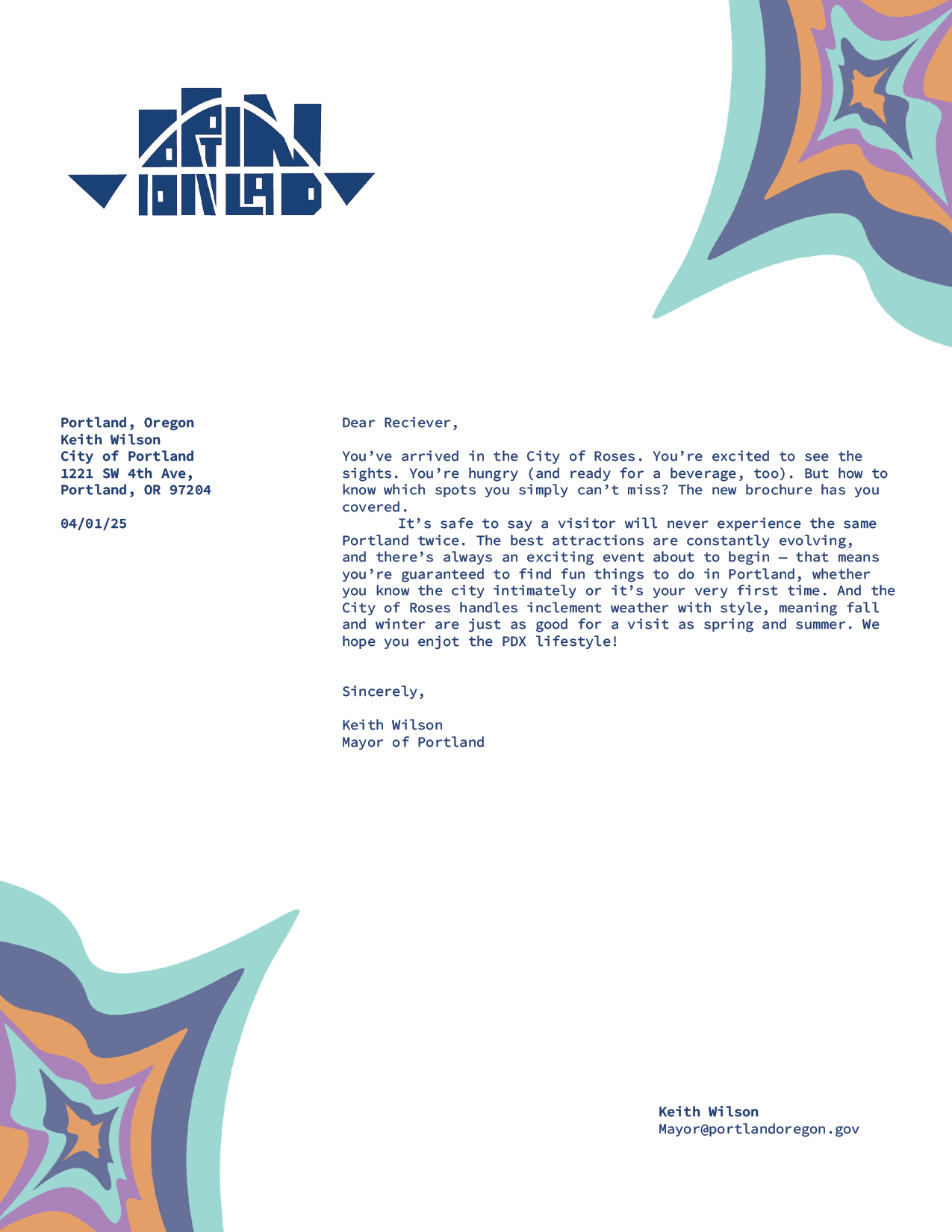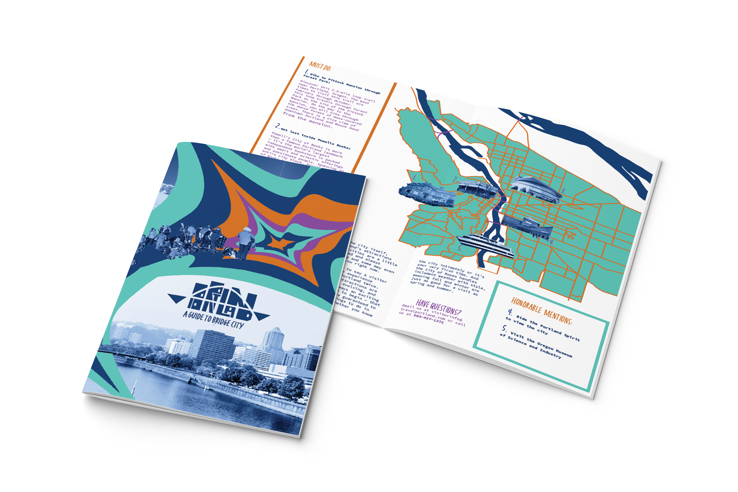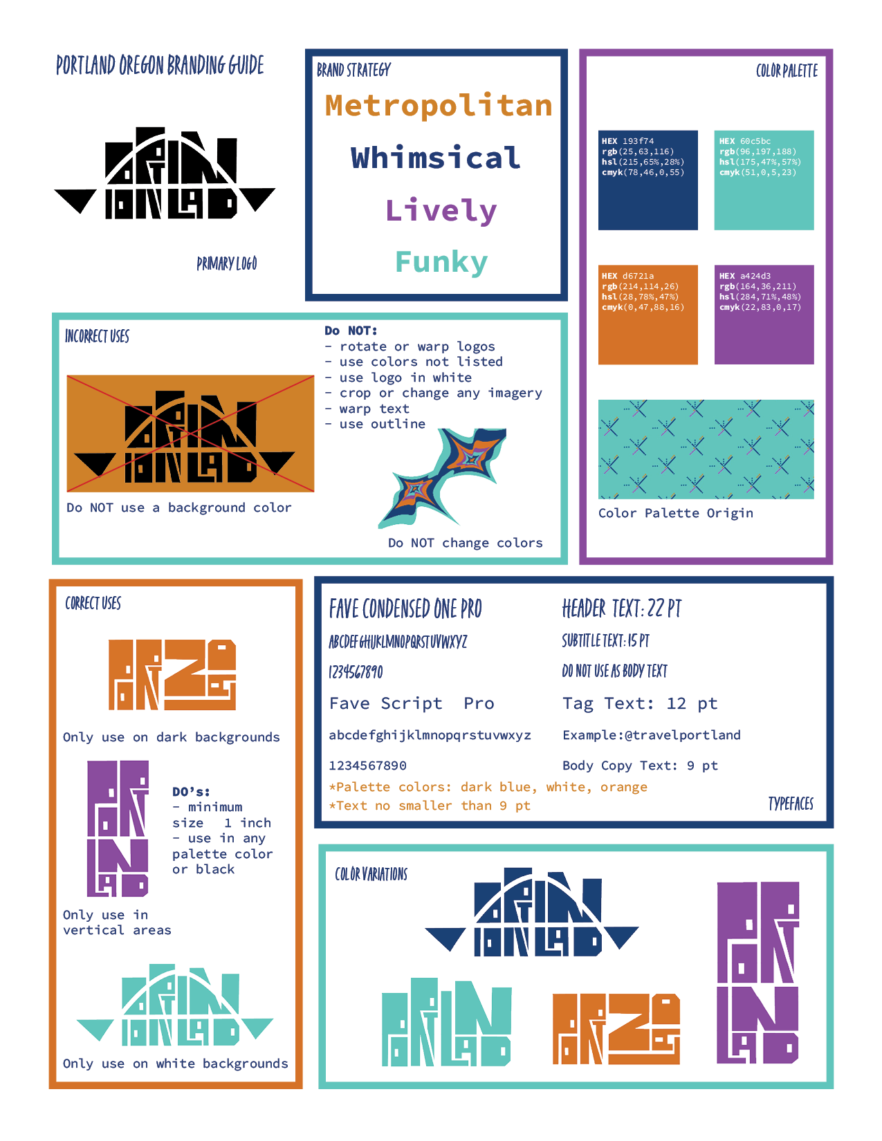 This rebrand for the eccentric city of Portland Oregon expresses the whimsical and artistic port town that aspires to be a hub for multiculturalism. Having been partially raised in this city, my firsthand knowledge of local happenings aided in the development of a funky brand identity that draws from the many quirks of Portland. The identity system I created is a fusion of the city skyline and the prominence of bridges that incorporates the colors popularized by the PDX airport. Through the use of form, color, and shape, I have developed an intuitively harmonious rebrand that embodies the bizarre yet formal nature of the environment and people of Portland Oregon.
