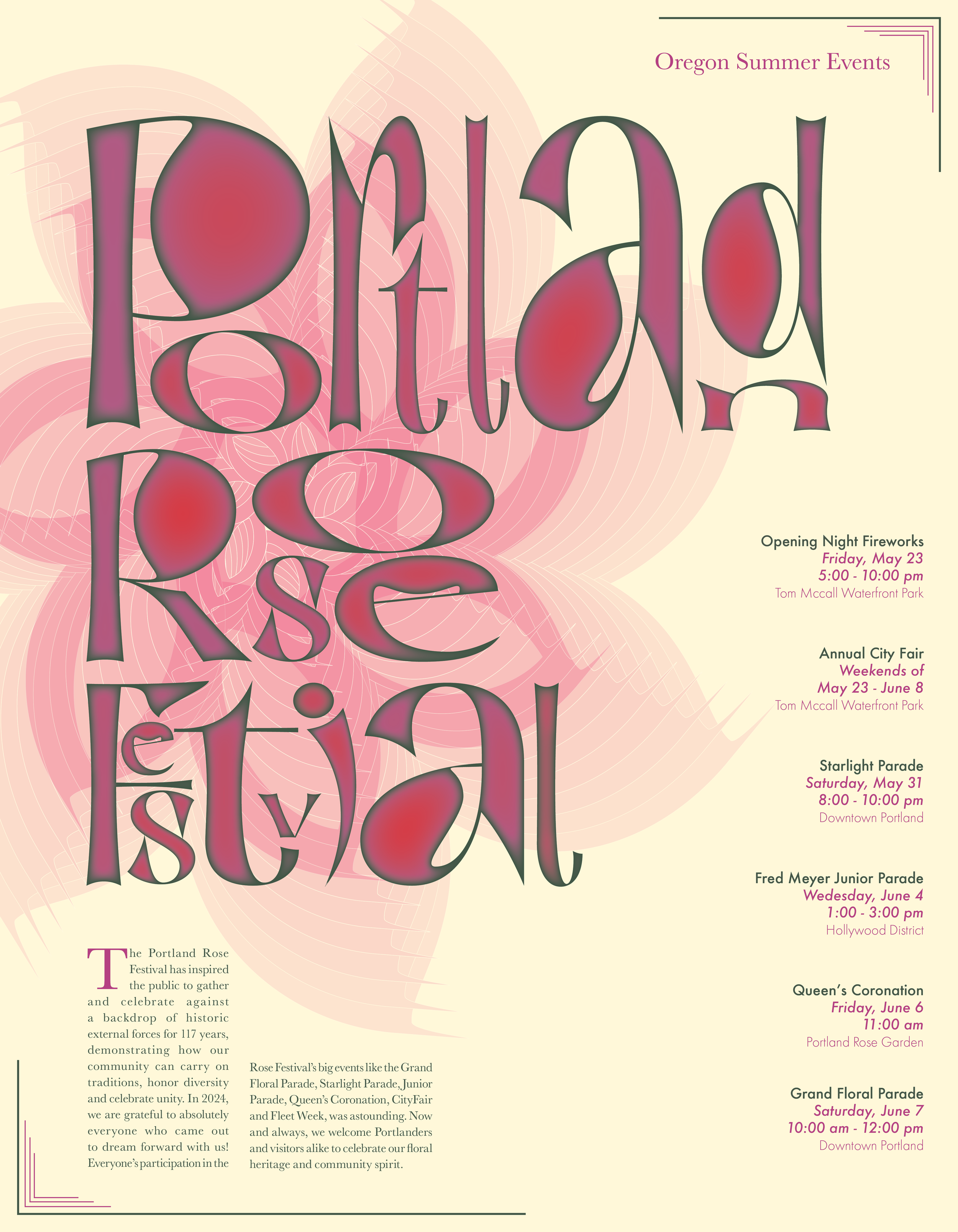 This Portland Rose Festival Poster was for a project that focused on manipulation of Typography as a means to portray necessary information in a relevant way that is also visually interesting. My personal knowledge of this particular festival aided in the optical construction of the magical feeling that the summer Portland Rose Festival encapsulates. The design I produced played with offsetting the size of letters within a word, distorting the closed counters, and reorganizing the layout of the individual words while reviving the colors utilized in vintage rose festival posters. My final poster embodies the warm spirit of a summertime flower festival within the limits of a substantial city by combining honest experience with typographical manipulation.
